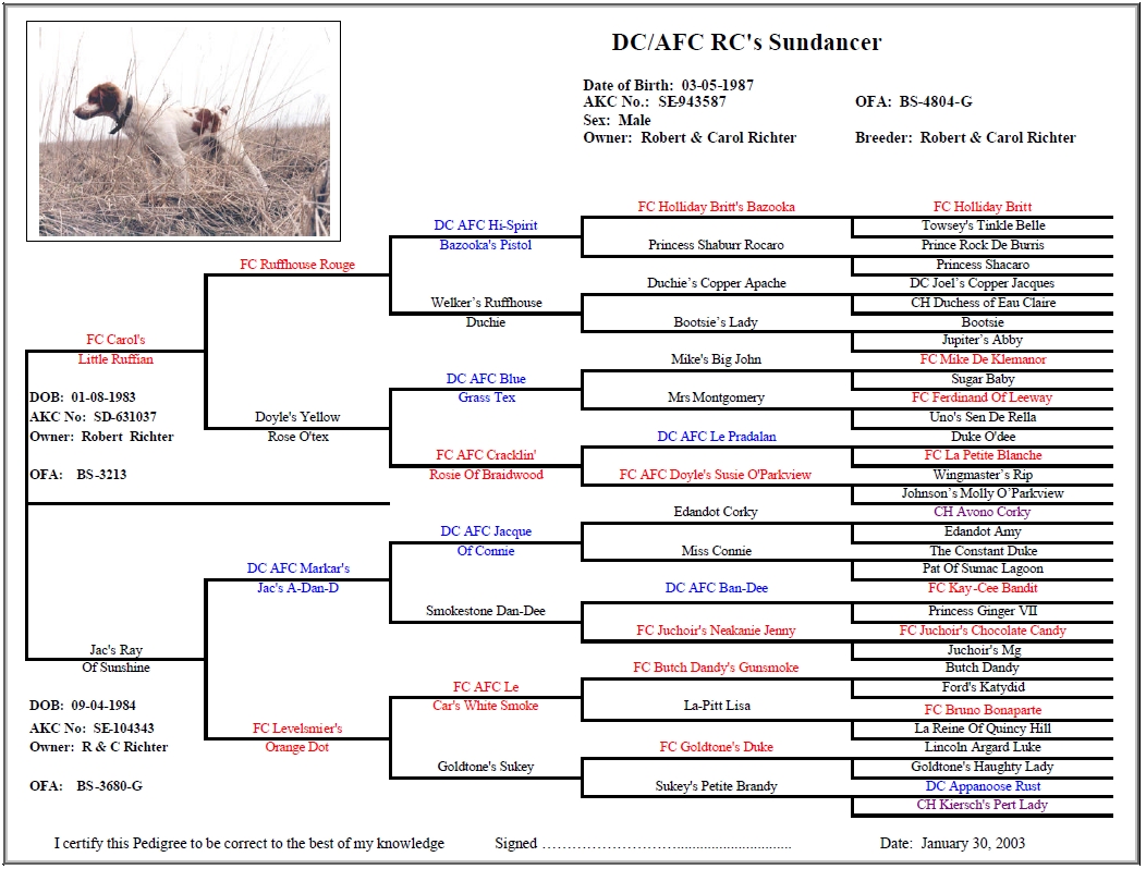 RC’s Sundancer, He was amateur trained and always amateur handled! His performances are remembered as always forward, and characterized by a driving, searching pattern. He had a total of 15 Ch’ship wins such as the 1995/96 Michigan Ch’ship, the 1996 Illinois Open Ch’ship, and the 1996/1997 Prairie State Open Ch’ship . He received the 1995 IAMS Brittany of the Year Award.